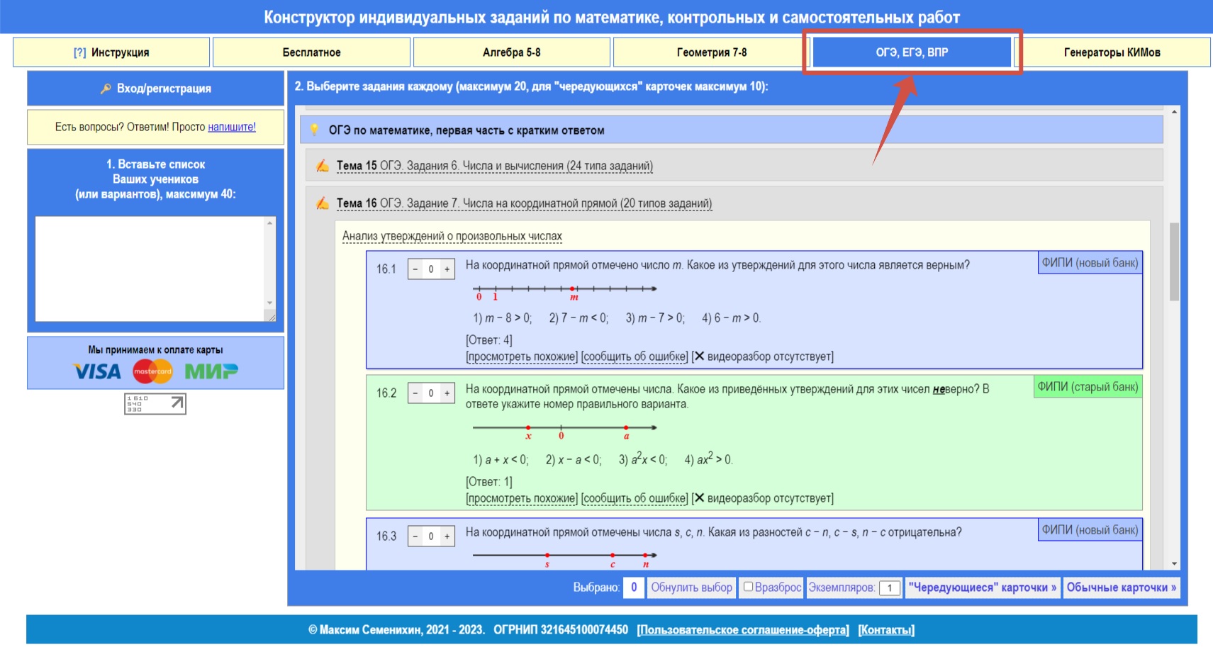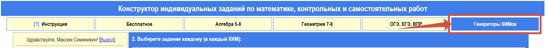 2) Перейти на страницу с генераторами КИМов (см. рисунок):