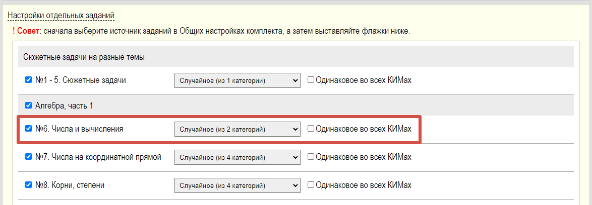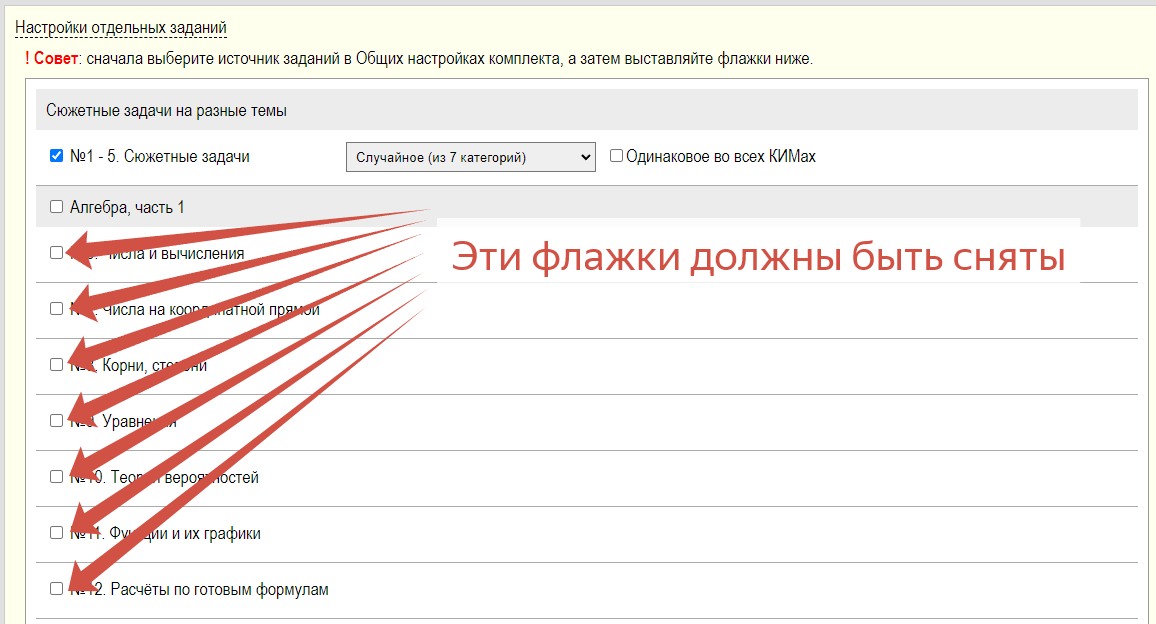 - КИМы без первых пяти заданий - нужно просто убрать единственный флажок "№1 - 5. Сюжетные задачи";