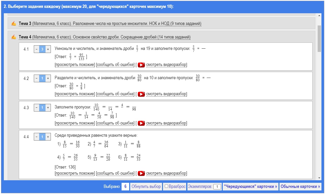 - выпадающий список категорий - можно указать, из каких категорий будет случайным образом выбрано задание;