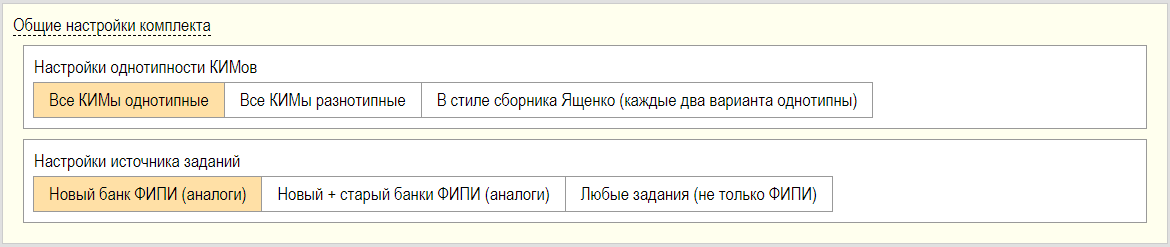 комплекта по умолчанию: все КИМы будут однотипными, а задания для них будут браться только из аналогов банка ФИПИ.