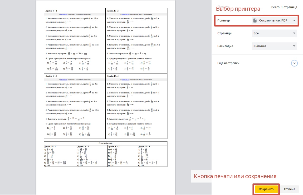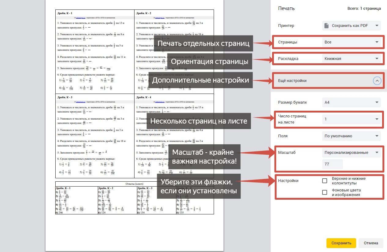 9) В появившемся окне задайте нужные настройки (особенно обратите внимание на выделенные ниже) и нажмите кнопку печати или сохранения: