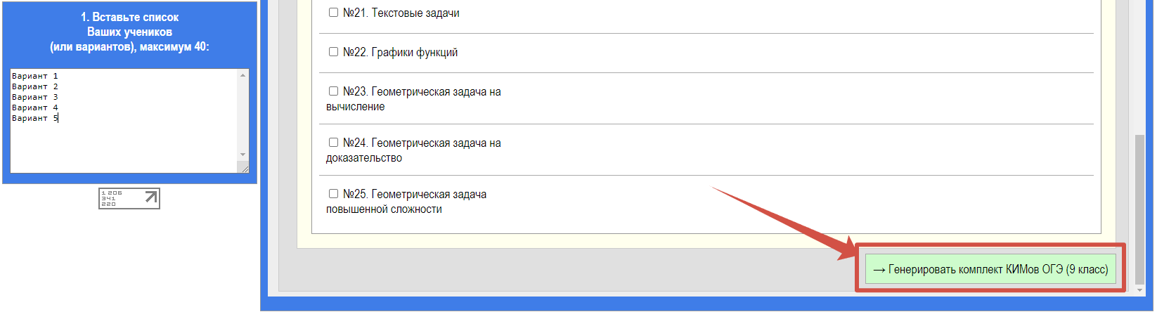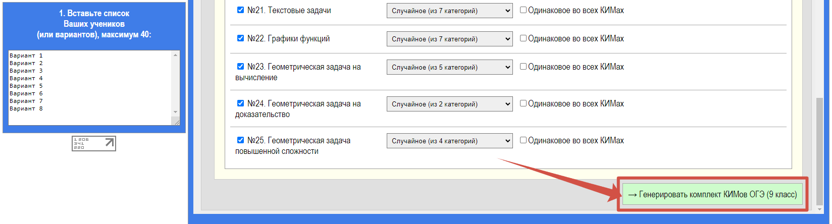 7) Нажать кнопку "Генерировать комплект КИМов ОГЭ (9 класс)":